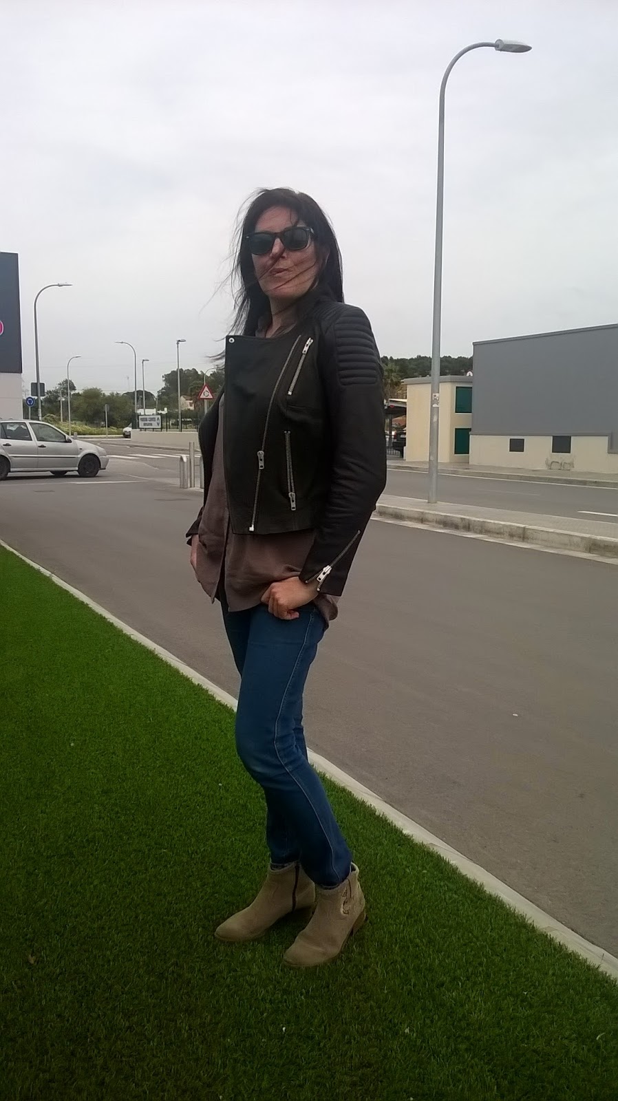 | Camisa taupe comprada en The First, vaqueros HM, botines Butterfly, bolso Zara y la estrella del look, biker de HM. |